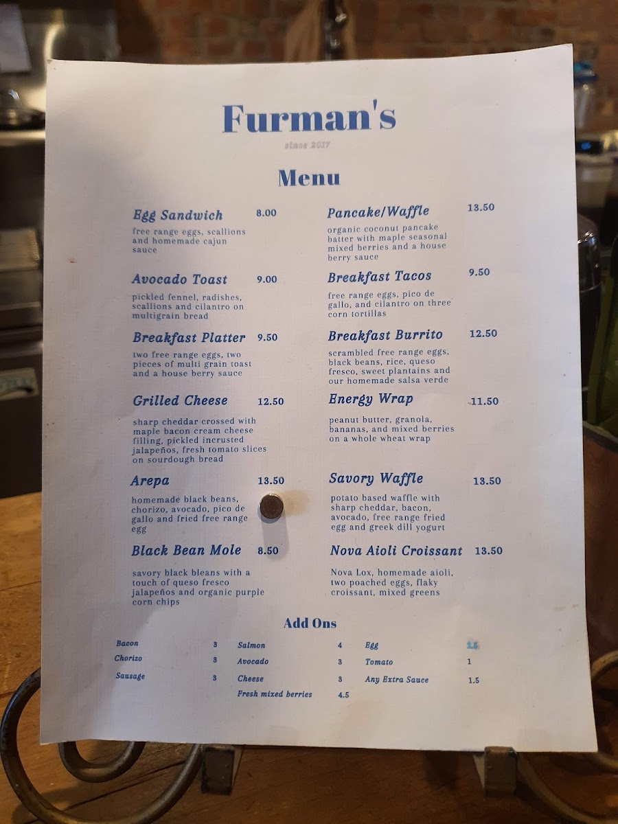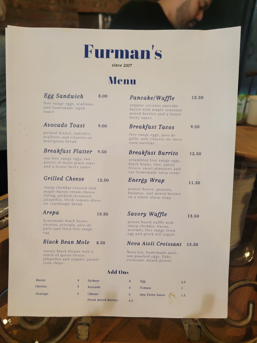 Overall, the offerings at Furman’s are well-suited to moments of quiet focus or casual conversation, fitting naturally into the calm rhythm of a Brooklyn neighborhood coffee shop.