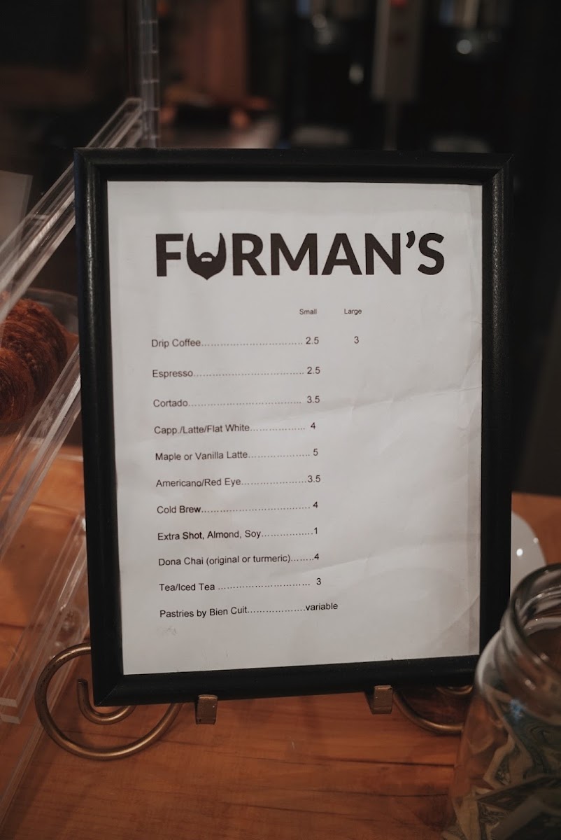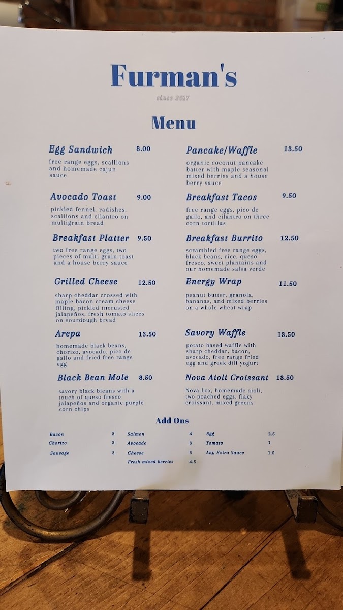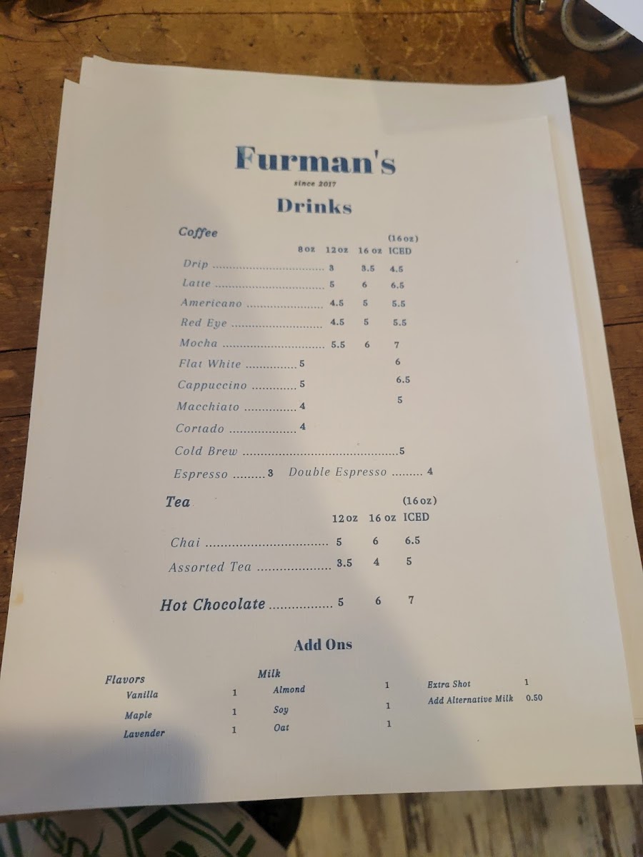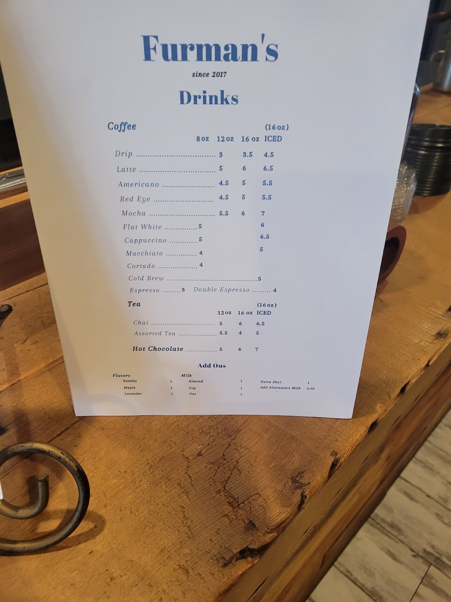 The menu at Furman's Coffee offers a thoughtfully curated selection of simple, comforting café fare paired with expertly crafted coffee drinks. Whether you’re stopping by for a morning pick-me-up or settling in for a focused afternoon, you’ll find a balance of casual bites and satisfying flavors that suit the relaxed, welcoming atmosphere.